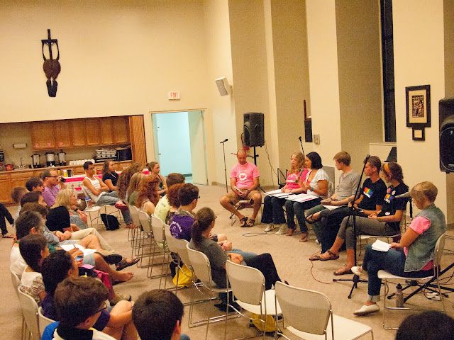 However, for LGBTQ youth, another important factor for deciding on a college besides which has the coolest t-shirt is how safe the campus feels. Pink Menno hosted a College Student Panel Discussion where representatives from the different Mennonite colleges spoke on their own safe space programs and events. Representing the colleges were: Christine Amstutz and Kerry Bush from Bluffton University, Pax Ressler from Goshen College, and Darian Harnish and Lisle Bertsche from Eastern Mennonite University. Luke Yoder and Annabeth Roeschley facilitated questions for the student panel before allowing for open questions from those who attended.